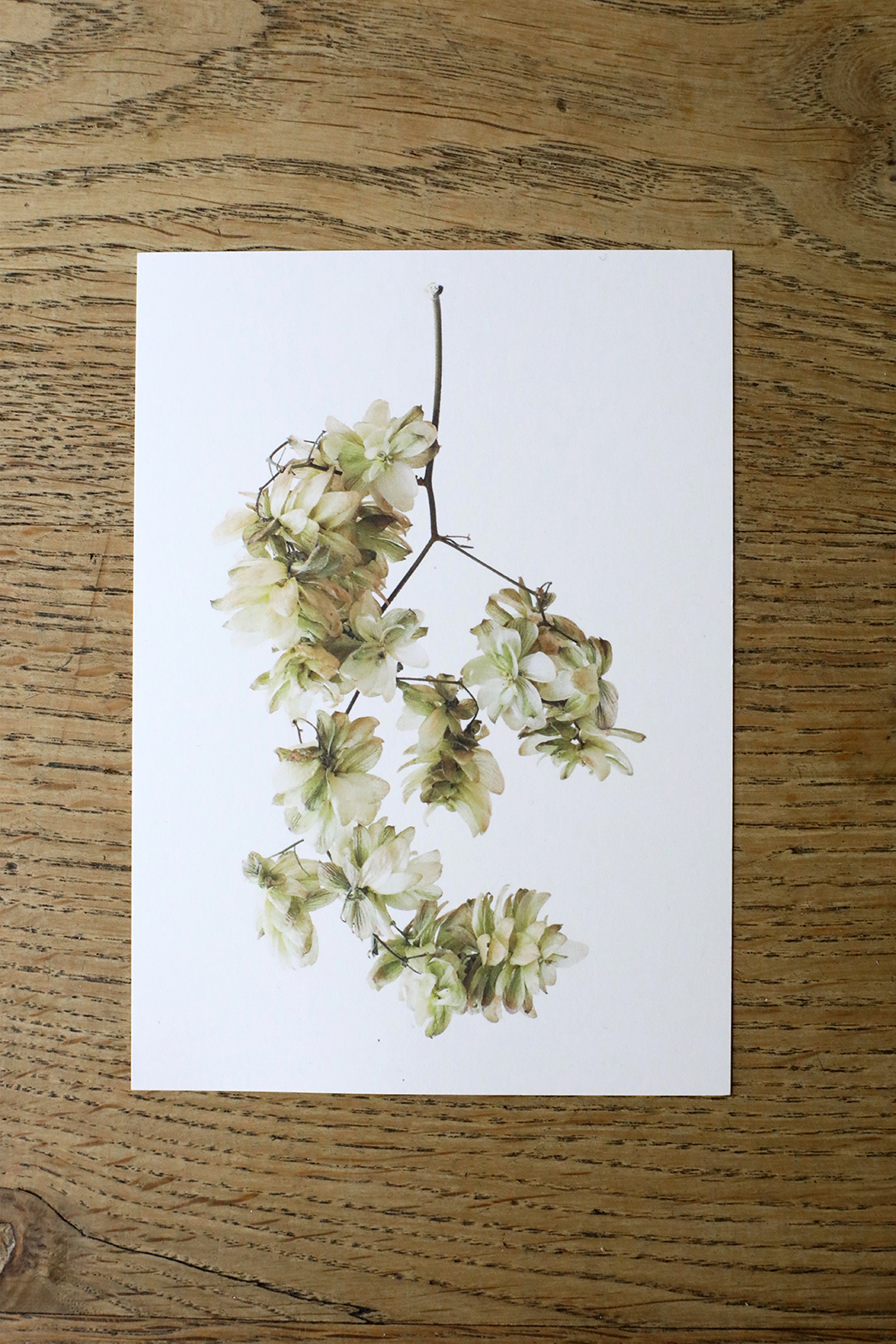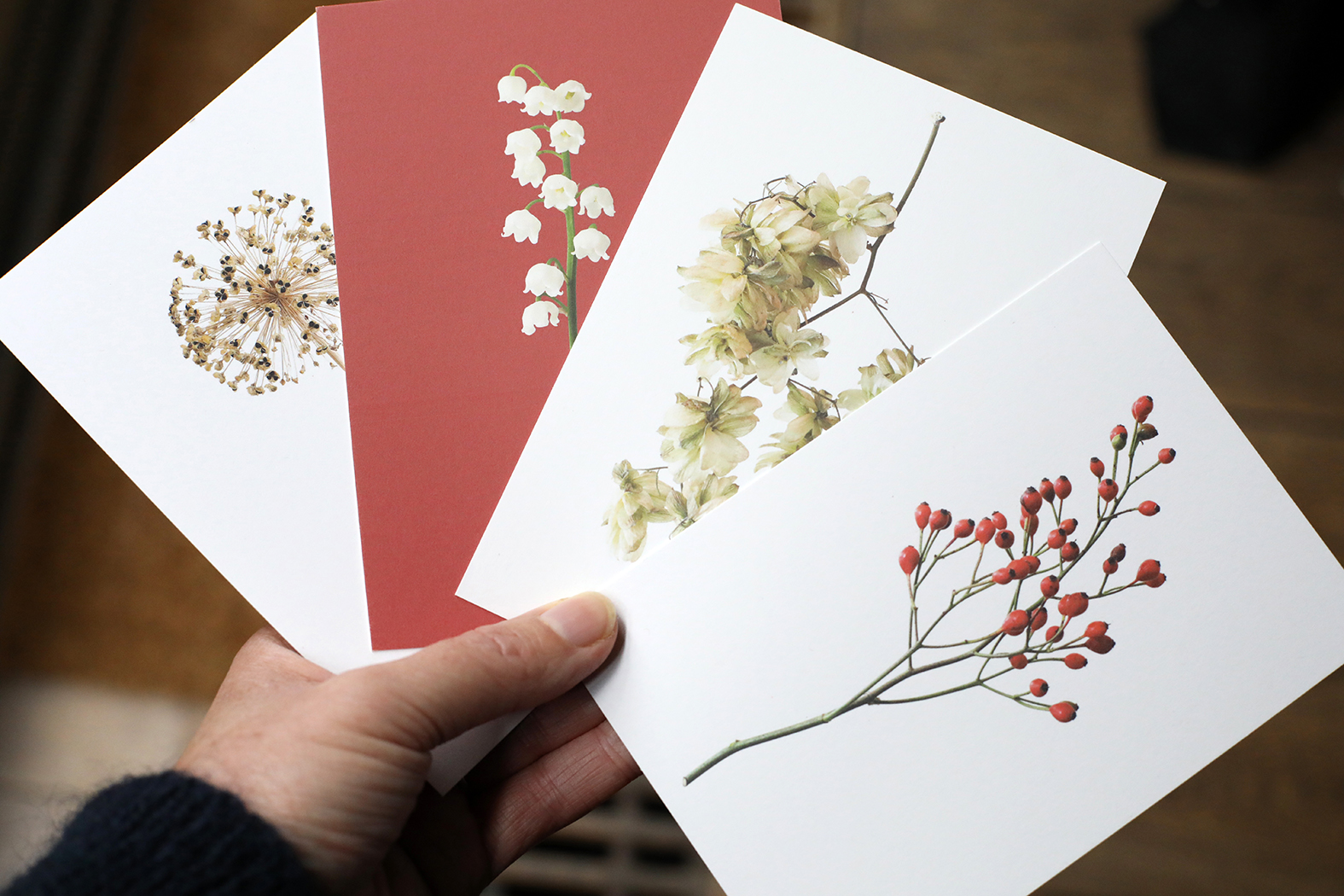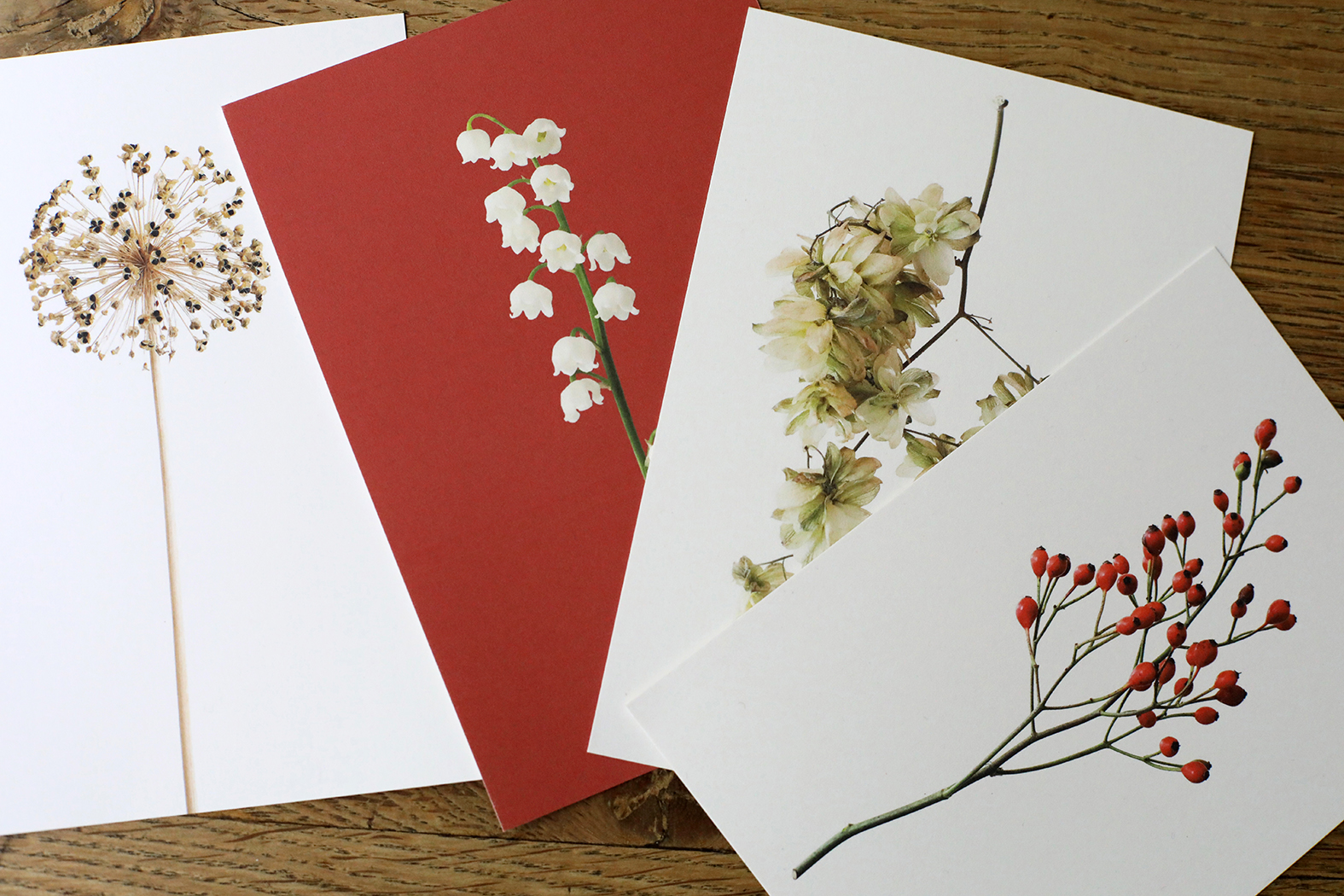 Tijd voor weer een nieuw setje ansichtkaarten met vondsten uit de natuur&tuin. Zo vlak voor de feestdagen koos ik voor Rozenbottels, Lelietje-van-dalen, Hop en Allium. Met de symbolische betekenissen liefde, geluk, bescherming en gezondheid nog leuker om als kerst- en of nieuwjaarskaart te versturen. De foto’s zijn geprint op gebroken wit 300 grams kraft papier. De achterkant van de kaart is blanco. Er staat klein mijn naam, website adres en de naam van de plant of bloem op.